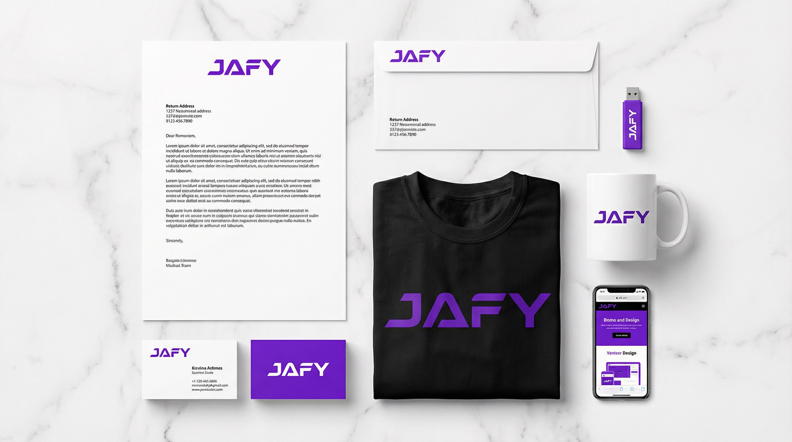 Complete JAFY brand identity system — letterhead, business cards, t-shirt, mug, USB, and mobile app, all unified under the purple brand.