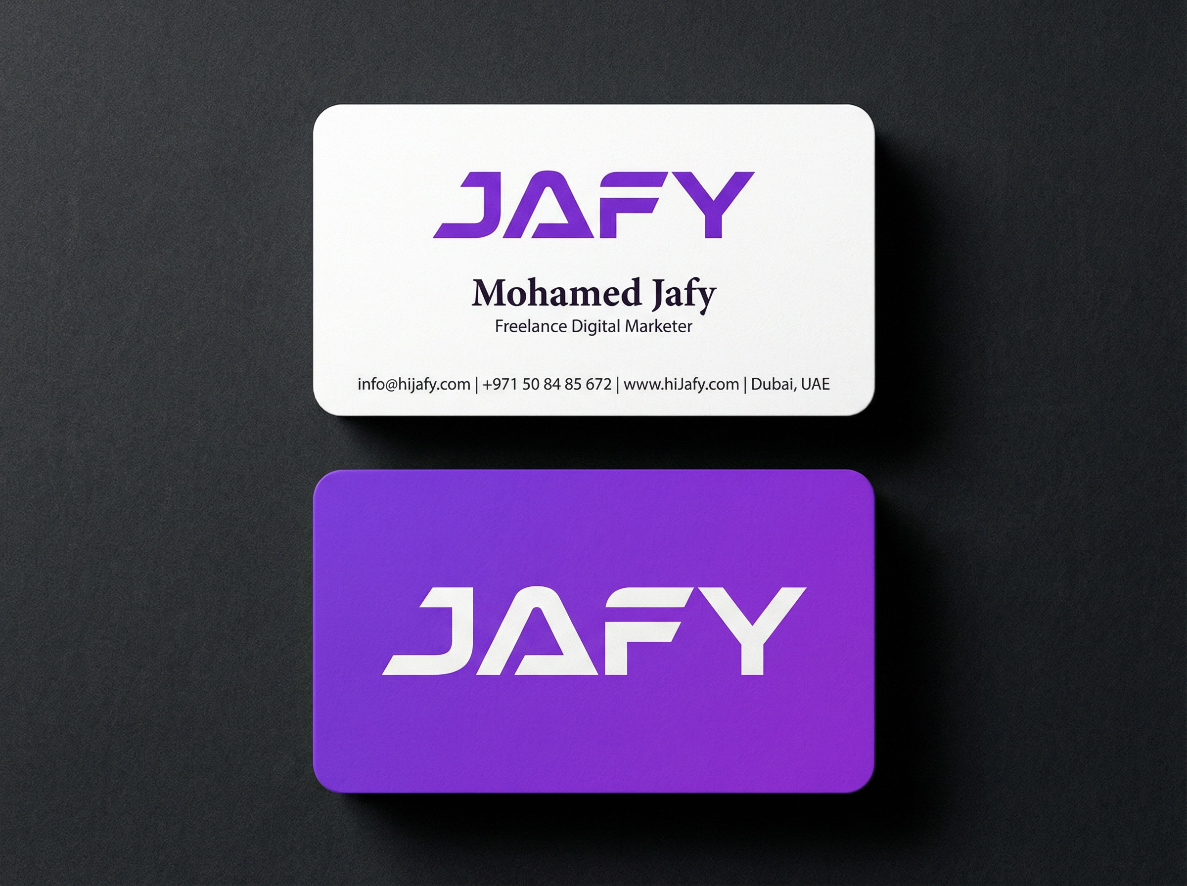 Front and back design — white front with purple JAFY logo, Mohamed Jafy name and contact details. Purple gradient back with white logo.